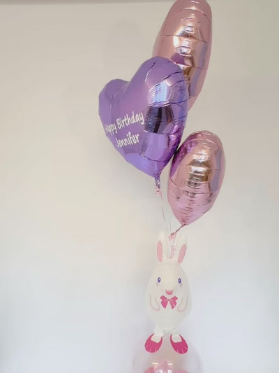 ハート型ホイルバルーン×3個 (うち1つメッセージ入り) うさぎバルーン×1個 クリアバルーン×1個 (ミニバルーン入り) 土台ラウンドバルーン×1セット |